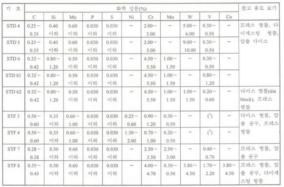 그 때문에 고강도의 고인 고속도공구강과 분말하이스 · 열전도도가 크고 내용손성이 큰 텅스텐합금 · 몰리브덴 합금이 사용되 는 경우가 있지만 STD6, 61에 비해 인성이 낮으므로 주의가 필요 합니다.